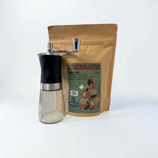 This gift includes a pack of our Christmas Coffee Beans & a stylish hand grinder to get your beans ground just the way you like.