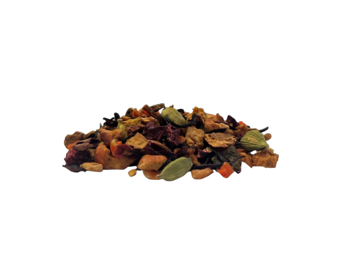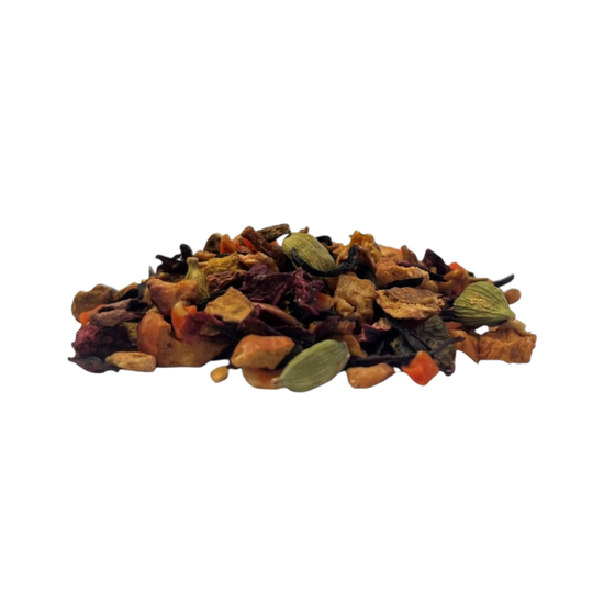On the palate, Pumpkin Pie Loose Fruit Tea is smooth, warming, and gently spiced. Sweet notes of apple and carrot are lifted by bright hibiscus, while cinnamon and cardamom add that classic pumpkin pie comfort. Pumpkin and pomegranate bring a mellow depth, with sea buckthorn and beetroot rounding out the blend. Brewed hot, the infusion reveals a bright red cup - soothing and aromatic, like a hug in a mug. It’s a cup that balances gentle sweetness with savoury warmth, evoking the flavours of autumn baking and cosy afternoons and evenings.